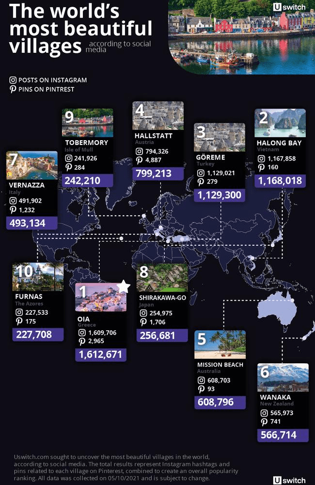 The company analysed how many times villages had been featured on Instagram in photos and hashtags and scraped Pinterest for how many times a village had been pinned.