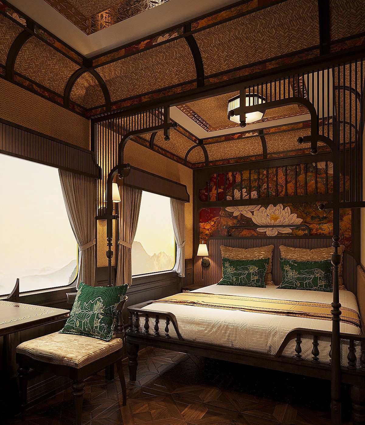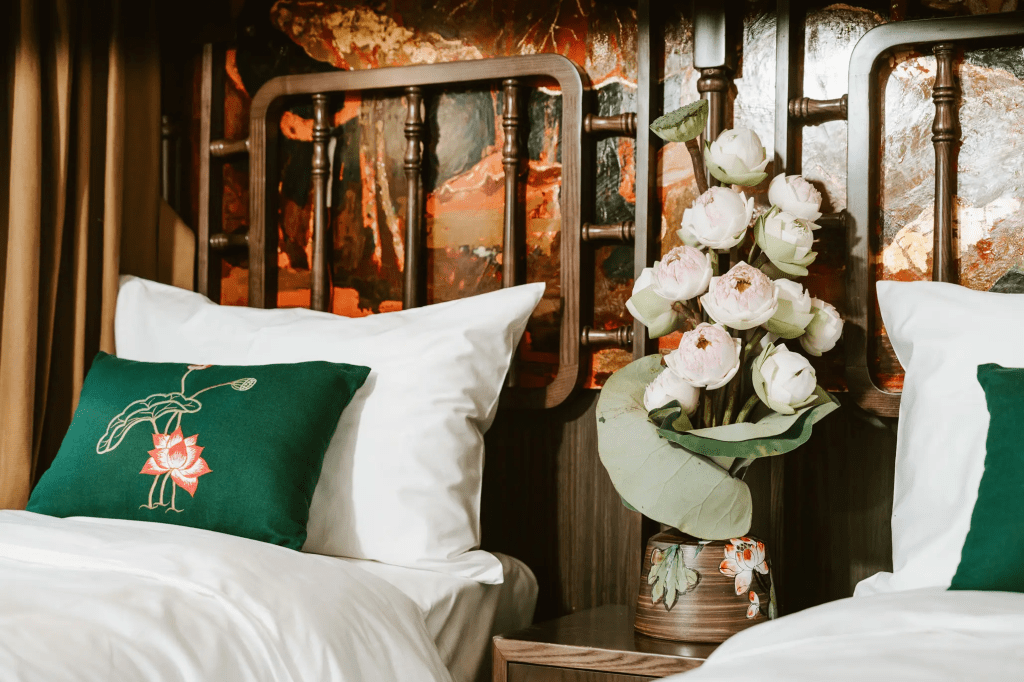 The SJourney train, with its 13 carriages (10 sleepers and 02 bistros), accommodates up to 60 passengers per trip. Each sleeping cabin is equipped with the amenities of a high-class hotel room, including a private bathroom and Indochinese-style furnishings.