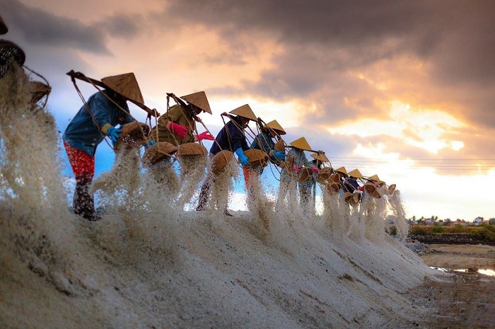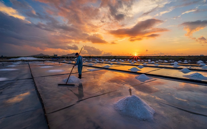 As summer arrives in south central Vietnam, the Hon Khoi salt fields in Khanh Hoa Province enter their most vibrant season. Under a blazing sun and cloudless skies, hundreds of salt farmers move in steady rhythm across the flats, transforming seawater into brilliant white crystals.